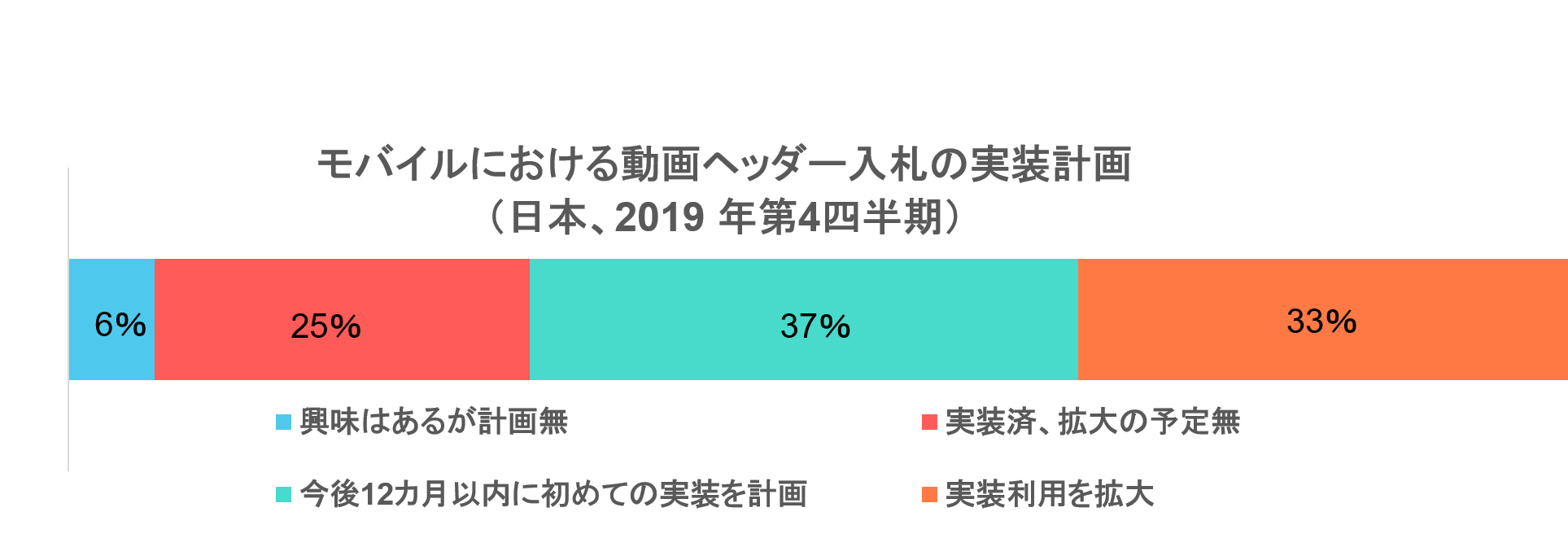 アプリ開発者が動画ヘッダー入札の実装において直面する技術的な課題にもかかわらず、来年はモバイルにおけるヘッダー入札の実装が大幅に増えることが予測されます。今後12カ月間で、モバイルへのヘッダー入札の実装はデスクトップへの実装を上回ると予想されます。調査では33%が「実装利用を拡大」、今後、37%が「初めての実装を計画している」と答えています。