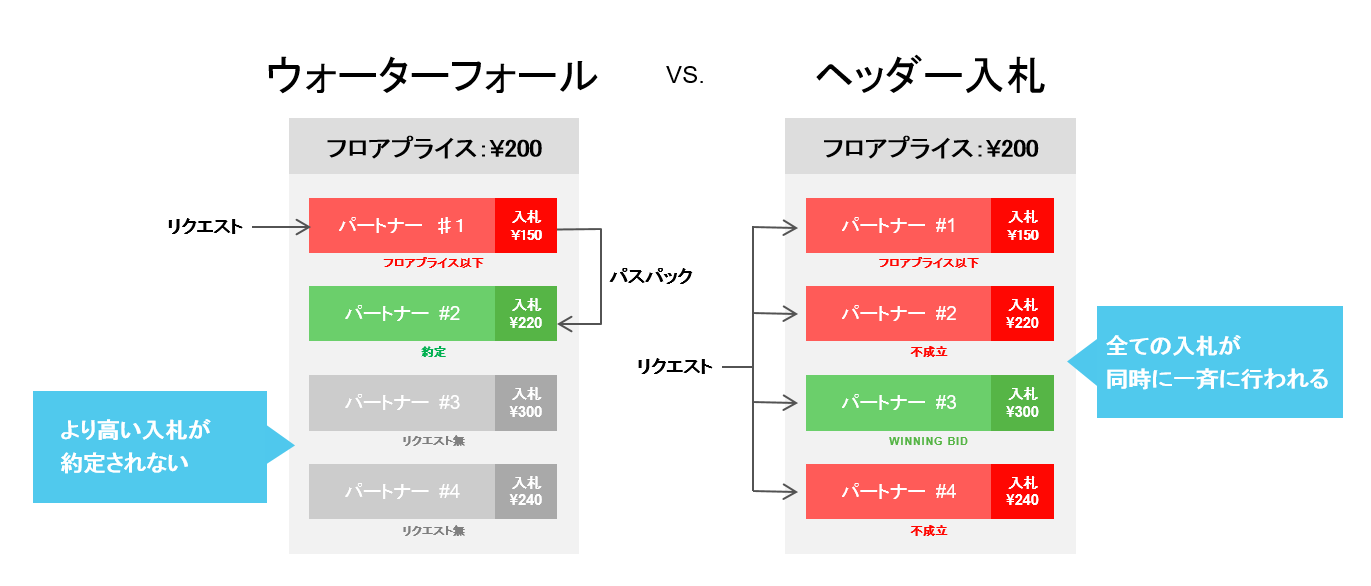 上記の左側はウォーターフォール型のオークション形式を示した図で、実際は上から3番目のパートナー#3が300円で約定する可能性があったにもかかわらず、ウォーターフォール型では上から順にリクエストを読み込むため、パートナー#2の220円の入札が約定してしまいます。一方で、右図の「ヘッダー入札」の場合は、それぞれのパートナーの入札が一斉に、かつ同時に行われることにより、最も価格の高い300円で入札しているパートナー#3が約定し、収益を最大化することができるのです。
